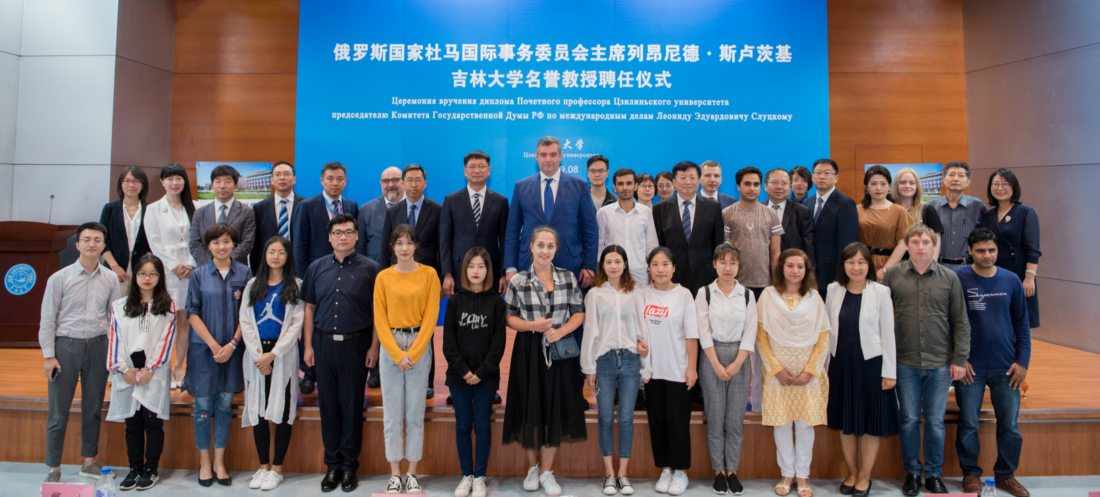 俄罗斯国家杜马国际事务委员会主席列昂尼德·斯卢茨基受聘吉林大学名誉教授并做主题报告
