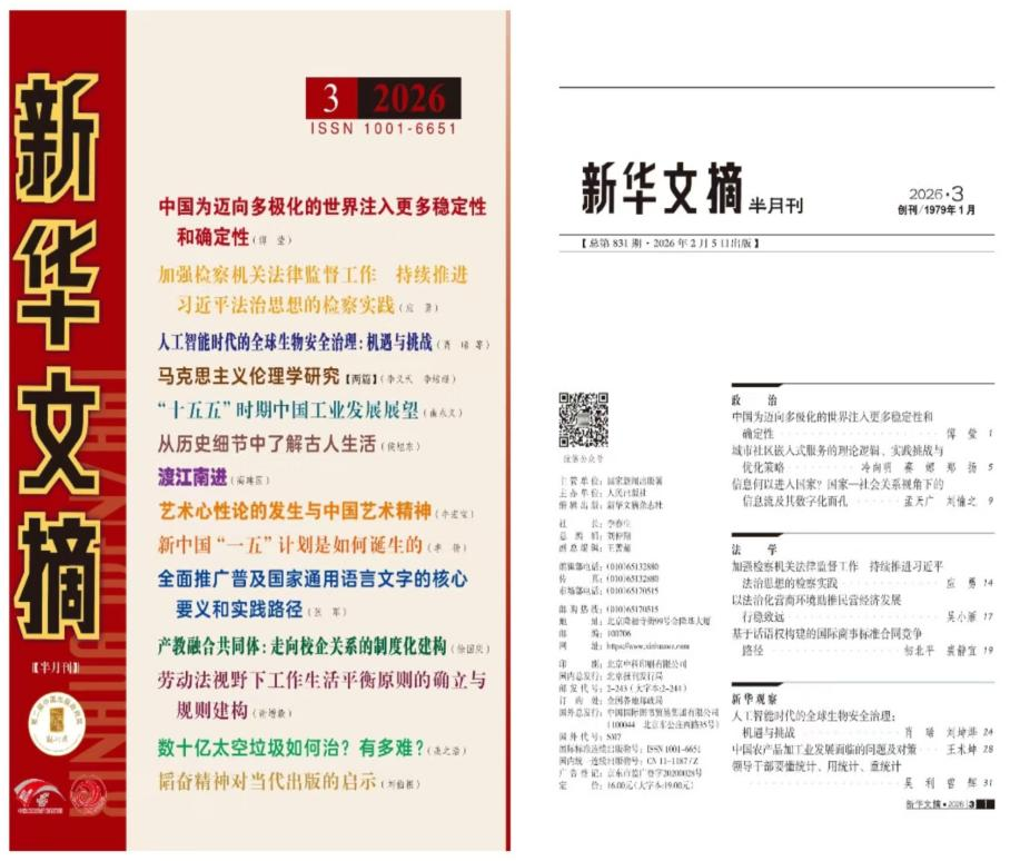 近日,《新华文摘》2026年第3期刊发了吉林大学肖晞教授、刘坤烨博士的研究成果《人工智能时代的全球生物安全治理:机遇与挑战》,文章原载于《上海交通大学学报(哲学社会科学版)》2025年第10期。研究立足于全球生物安全治理的重要性与紧迫性提升,耦合人工智能技术的勃兴,深入分析人工智能给全球生物安全治理带来的机遇与挑战。