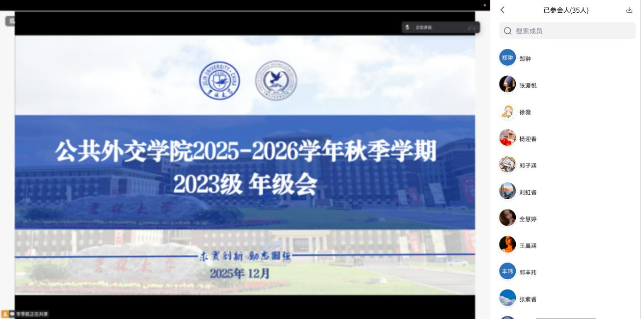 为了加强学风建设,严肃考试纪律,增强学生安全防范意识。12月11日,公共外交学院2023级本科生年级会议于线上举行,年级辅导员李老师与全体2023级本科生共同参加会议。