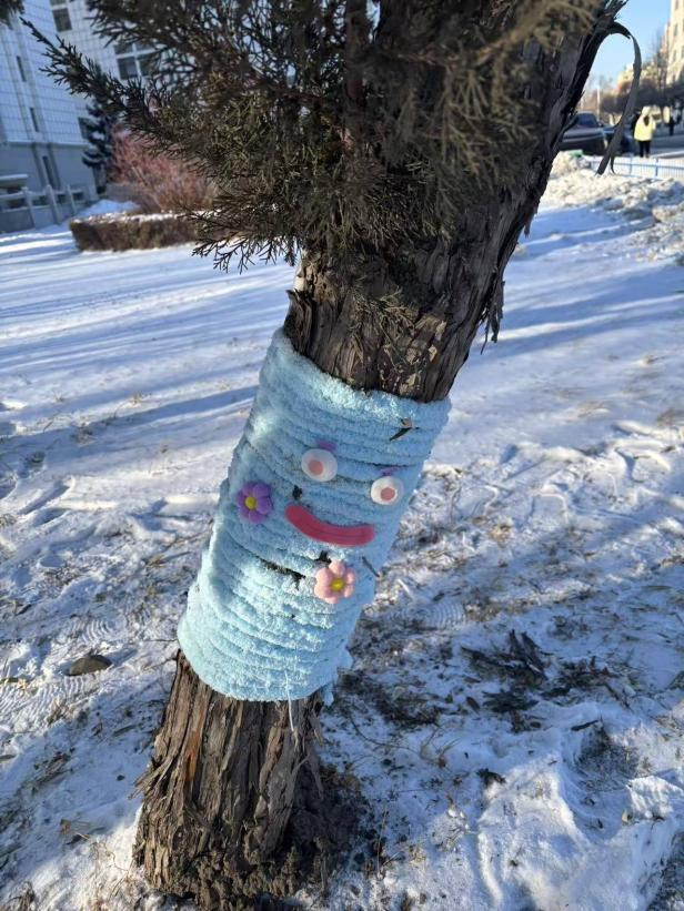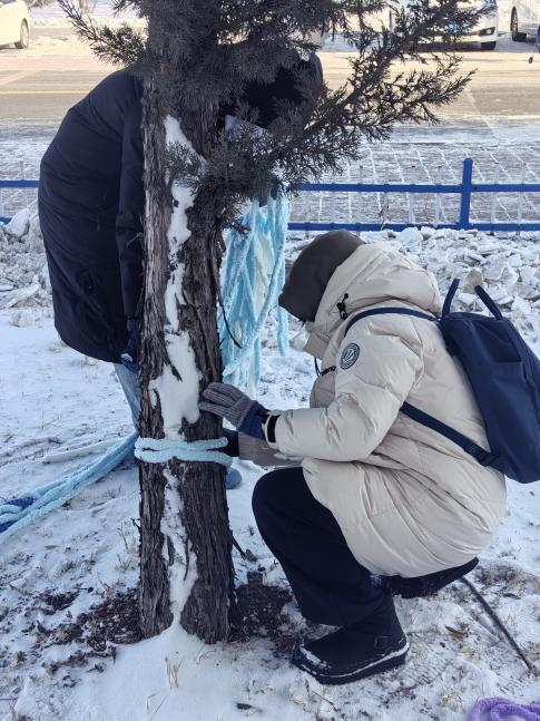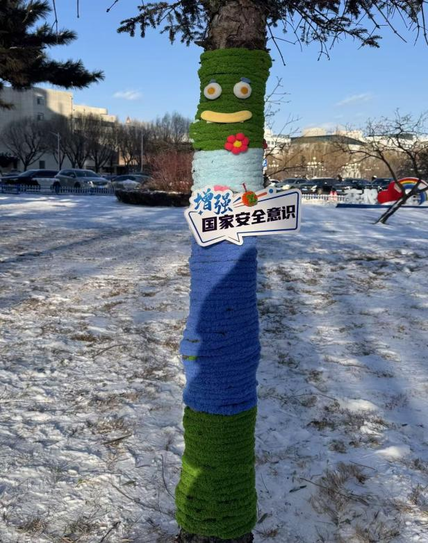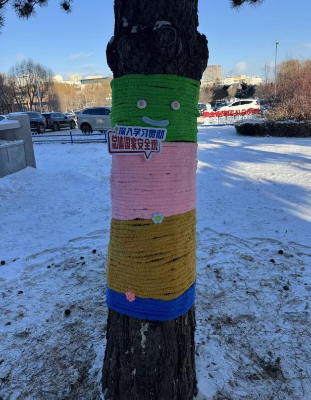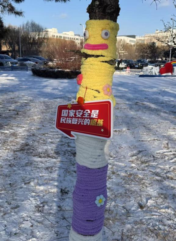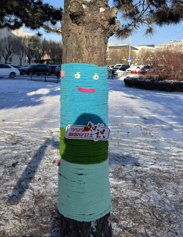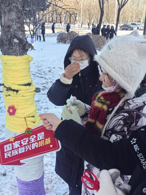 在亲身实践的劳动过程中,大家分工协作,配合默契,细心地将毛线紧密地缠绕在树干上,为树木编制保暖树衣,并在现场设置了印有“国家安全,人人有责”“共筑防线,青春同行”等字样的宣传展板,强化宣传氛围。