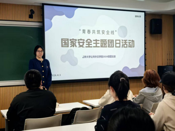 4月9日,新学期首次团课顺利举行。团课由本科生团委副书记刘虹睿主持,吉林大学践行总体国家安全观宣讲团成员、国家发展与安全研究院国家安全学硕士研究生陈佳乐主讲,主题为“践行总体国家安全观,夯实政治安全根基”。
