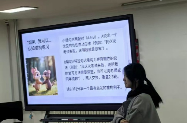 随后,班会围绕“提升心理韧性”这一核心目标展开了多个轻松有趣的活动。在“韧性温度计”环节,大家用手势为自己的心理韧性打分,并进行了分享;在“逆境中的优势清单”中,同学们写下挫折及自己应对时的优点,同伴互相补充未被察觉的闪光点;“思维重构”练习中,两两配对将“我就是不行”等消极表达转化为“这次没做好,下次换个方法试试”的积极思考;“心理支持圈”则引导大家画出身边能给予支持的人,并坦诚讨论遇到困难时不敢开口求助的顾虑。